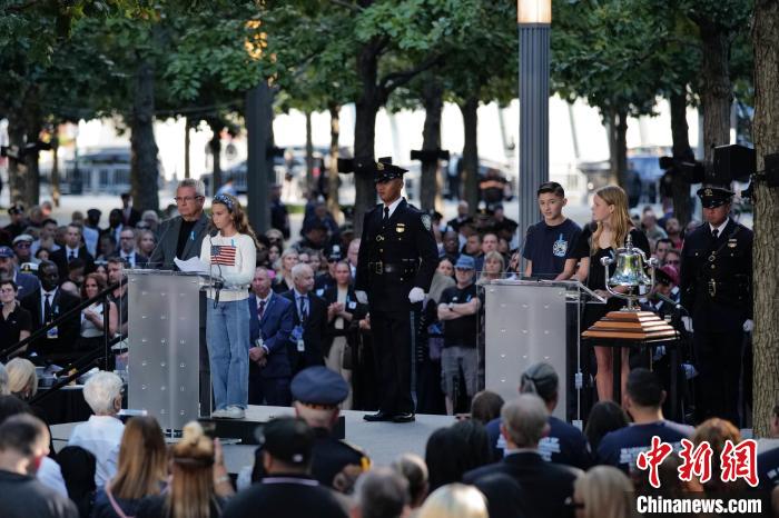 当地时间9月11日,“9·11”事件23周年纪念活动在纽约世贸中心遗址广场举行。图为“9·11”事件遇难者亲属代表登台依次念出遇难者姓名。 中新社记者 王帆 摄