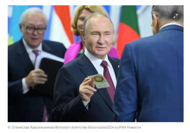据《俄罗斯报》、俄新社当地时间23日报道,俄罗斯总统普京在喀山金砖国家峰会期间展示了一张具有象征意义的“金砖国家钞票”票样。