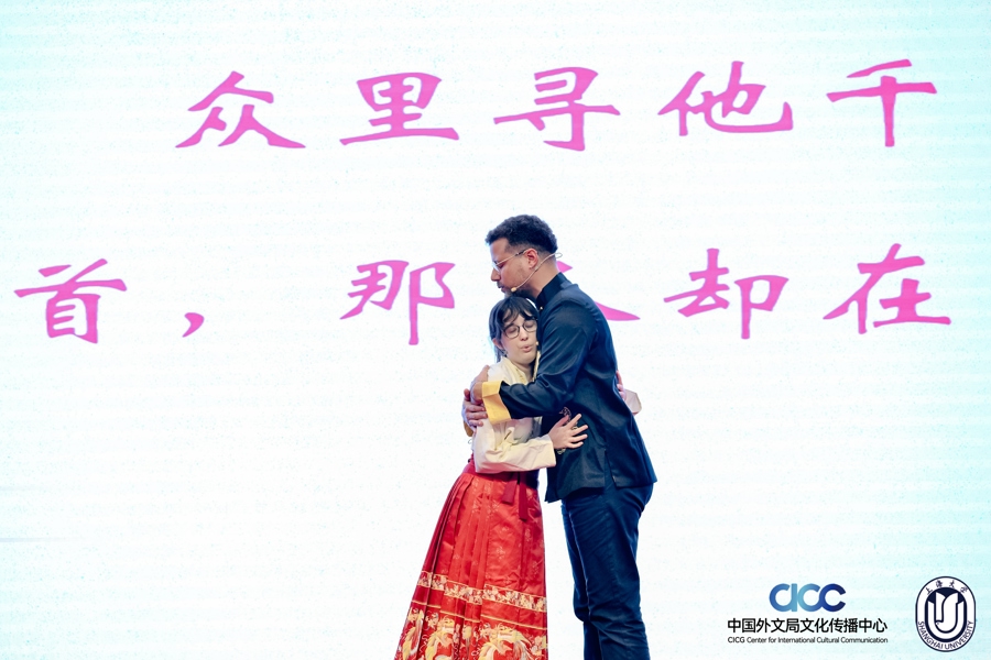 从南北美洲远道而来的国外参赛吟诵队伍,现身在第三篇章“情思悠长”。比美国友人更加“不远万里”而来的,是巴西巴伊亚联邦大学的CUNHA FARIAS OLIVEIRA ALICE和SANCHES GOMES FRANCISCO,两人带来同为南宋词人的辛弃疾名篇《青玉案·元夕》。尽管还没有全面而系统的中华文化知识积累,他们却以自身的理解体悟及相拥一处的肢体语言,吟诵出了别具韵味又同样动人的“众里寻他千百度,蓦然回首,那人却在,灯火阑珊处”。
