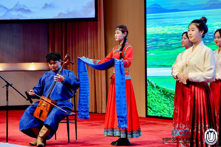 形式方面,呼和浩特职业学院的杨青叶、张仪等12位同学共同吟诵《敕勒歌》,他们雄浑而厚重的嗓音,伴随多种器乐的节奏,瞬间将观众带入“天苍苍,野茫茫”的壮阔画卷之中,观众不禁对那天高地阔、牛羊成群的北方草原产生美好向往与无限憧憬。古谱诗词研究专家、上海音乐学院杨赛教授认为,中国诗词是中华文化共同体的核心部分、中外文化交流的平台、最接地气的文化,“这一点在内蒙古学生带来的《敕勒川》中有很好的体现,节目将马头琴、呼麦、钢琴等多种文化元素相互糅合,使其别具面貌。”