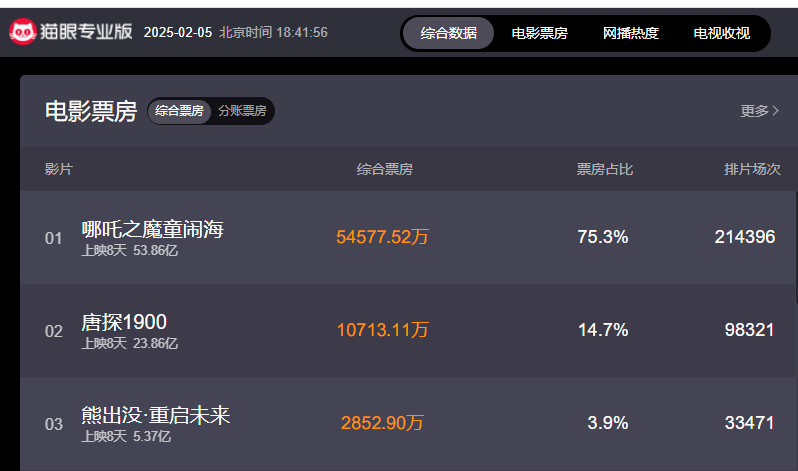 据潇湘晨报,2月5日,电影《哪吒之魔童闹海》票房破54.14亿,超越《你好,李焕英》,挤进中国电影票房榜前三。