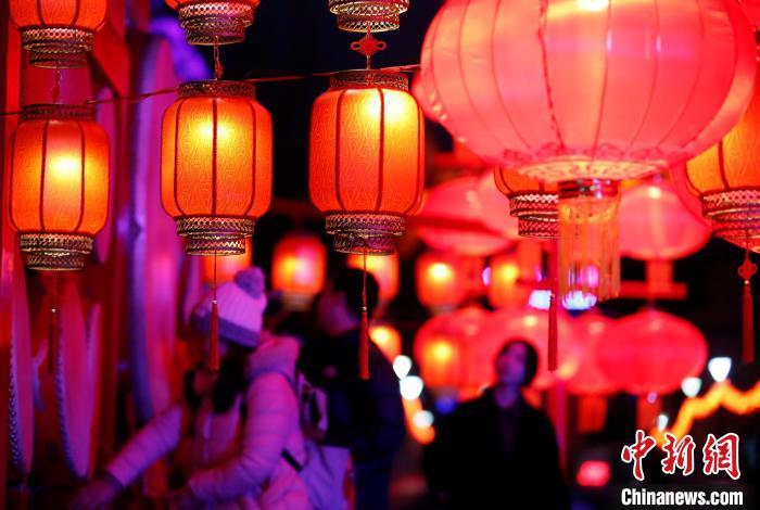 资料图:元宵节将至,北京模式口大街灯火璀璨,吸引众多民众游览打卡。中新社记者 张祥毅 摄