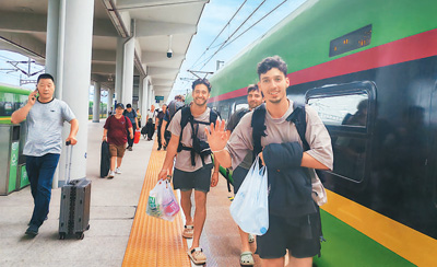 外国旅客乘坐中老铁路跨境旅客列车抵达云南磨憨站。黄远飞摄