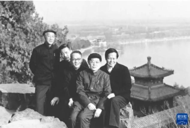 △1974年,杨振宁、周光召、黄宛、邓稼先、黄昆(从右至左)游览北京颐和园时合影。
