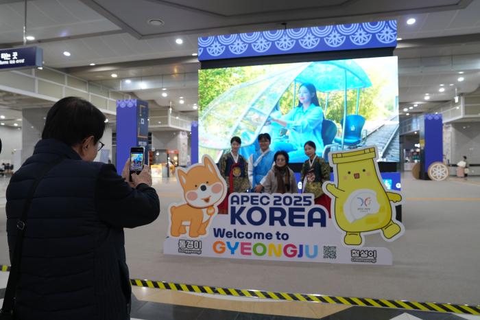 当地时间10月27日,人们在庆州火车站内APEC主题打卡点拍照留念。亚太经合组织(APEC)第三十二次领导人非正式会议将于10月31日至11月1日在韩国庆州举行。 中新社记者 刘旭 摄