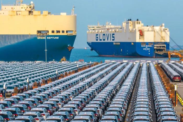 资料图:2023年3月17日拍摄的烟台港外贸商品车“出海”场景。(无人机照片) 中新社发 山东港口烟台港 供图