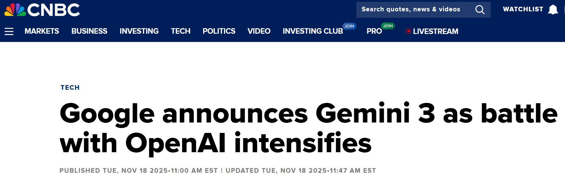 外媒称,Gemini 3 的推出距离上一代 Gemini 2.5 仅 8 个月,迭代节奏明显加快;谷歌同时坐拥自研芯片、搜索入口与数十亿终端用户,为其对抗 8 月已发布 GPT-5 的 OpenAI 提供了差异化竞争筹码。