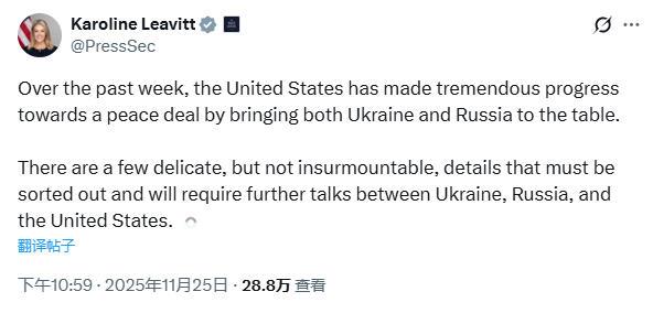 △美国白宫新闻秘书莱维特25日发布声明称:“还有一些棘手但并非不可克服的关键细节亟待解决“。