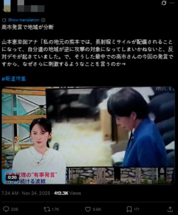 在社交媒体平台上,一名网友援引日本主播的评论表示:“在我的家乡熊本,由于(日本政府)决定部署长程导弹,当地已出现抗议集会。在此风口浪尖,高市却发表此番言论——(人们不禁质疑)她为何要火上浇油?”