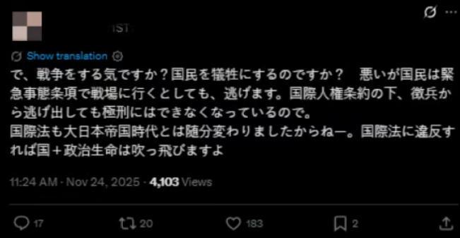 一些日本网友愤慨地留言道:“(高市政权)是执意要发动战争吗?是准备让民众去当‘炮灰’吗?任何违反国际法的行为,都将导致该国及其决策者的政治生命彻底终结。”