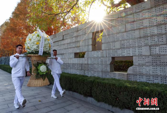 肃穆乐声中,纪念馆向南京大屠杀死难同胞敬献花篮。全体人员向南京大屠杀死难同胞三鞠躬,依次走到“哭墙”前,将手中的菊花轻轻摆在地上。