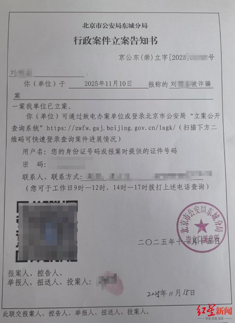 随后,小刘报警,11月10日,北京市公安局东城分局崇文门派出所已经立案。12月3日,记者联系到崇文门派出所,民警表示案件若有进展会联系当事人。
