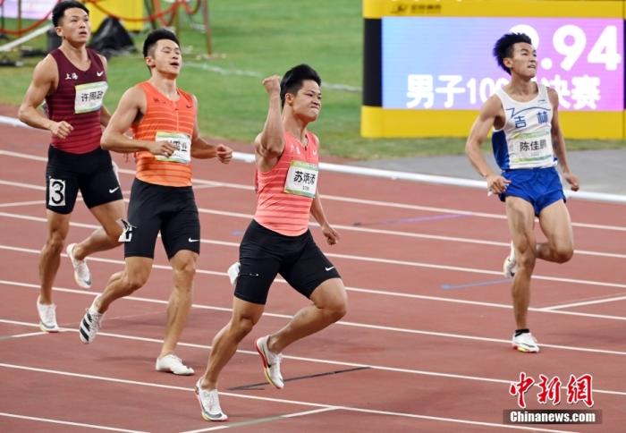 在西安举行的第十四届全运会男子百米飞人大战中,来自广东的苏炳添以9秒95的成绩获得冠军。中新社记者 毛建军 摄