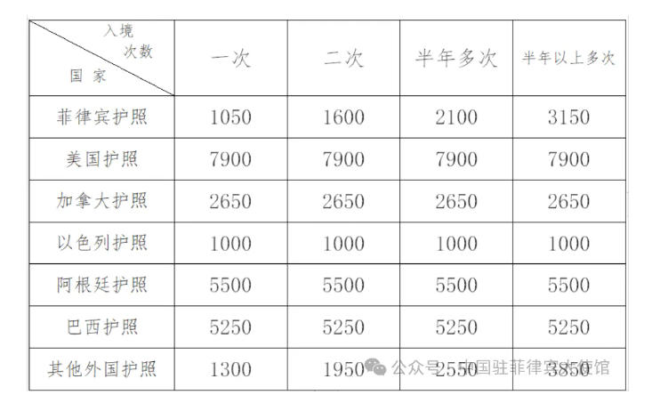 驻菲律宾使馆签证费用表