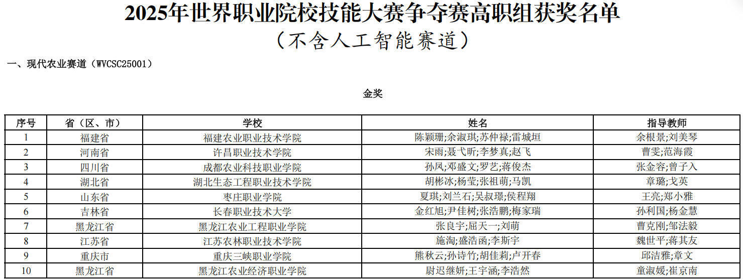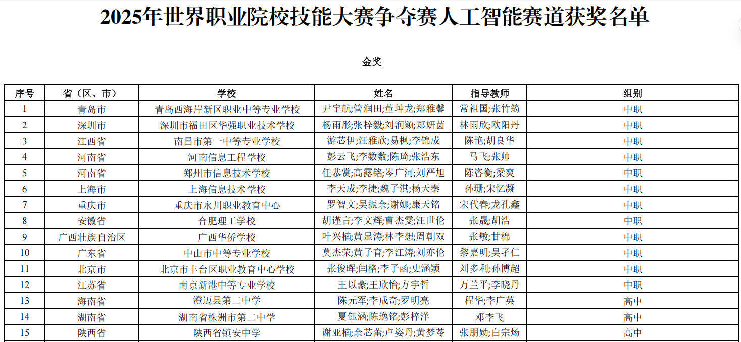 教育部日前公布了2025年世界职业院校技能大赛获奖名单。