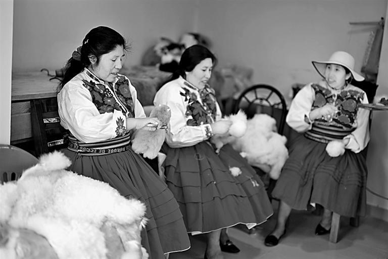 在秘鲁阿雷基帕,工作人员在羊驼毛制品工坊制作羊驼玩偶。新华社发