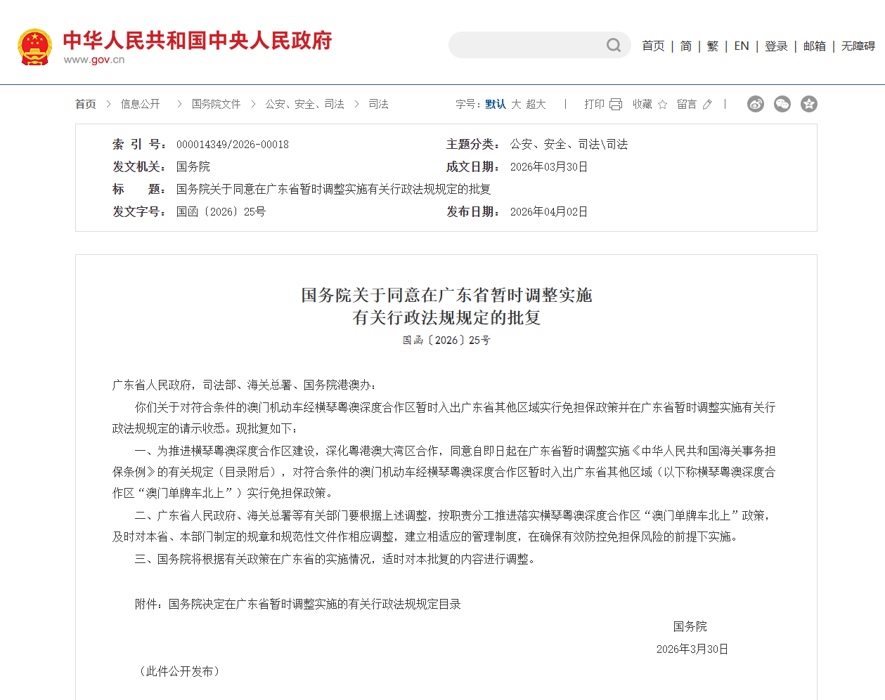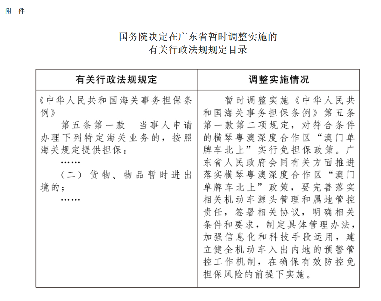4月2日,中国政府网发布《国务院关于同意在广东省暂时调整实施有关行政法规规定的批复》,同意自即日起在广东省暂时调整实施《中华人民共和国海关事务担保条例》的有关规定,对符合条件的澳门机动车经横琴粤澳深度合作区暂时入出广东省其他区域实行免担保政策。这意味着横琴“澳门单牌车北上”政策实施取得重要进展。
