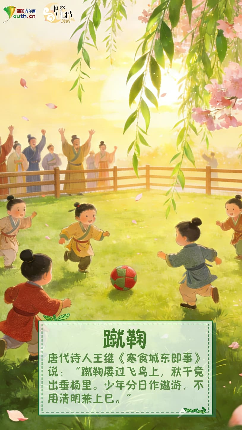 唐代诗人王维《寒食城东即事》说:“蹴鞠屡过飞鸟上,秋千竟出垂杨里。少年分日作遨游,不用清明兼上巳。”