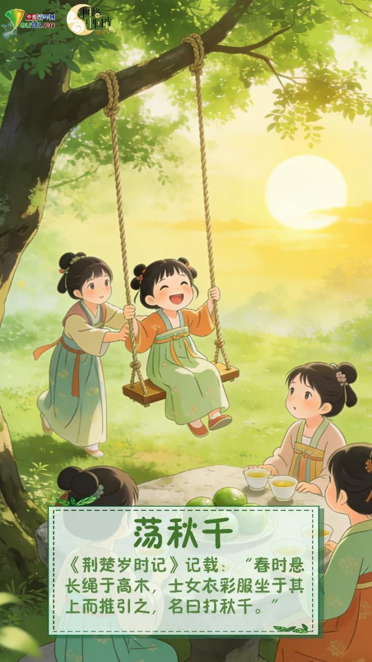 《荆楚岁时记》记载:“春时悬长绳于高木,士女衣彩服坐于其上而推引之,名曰打秋千。”