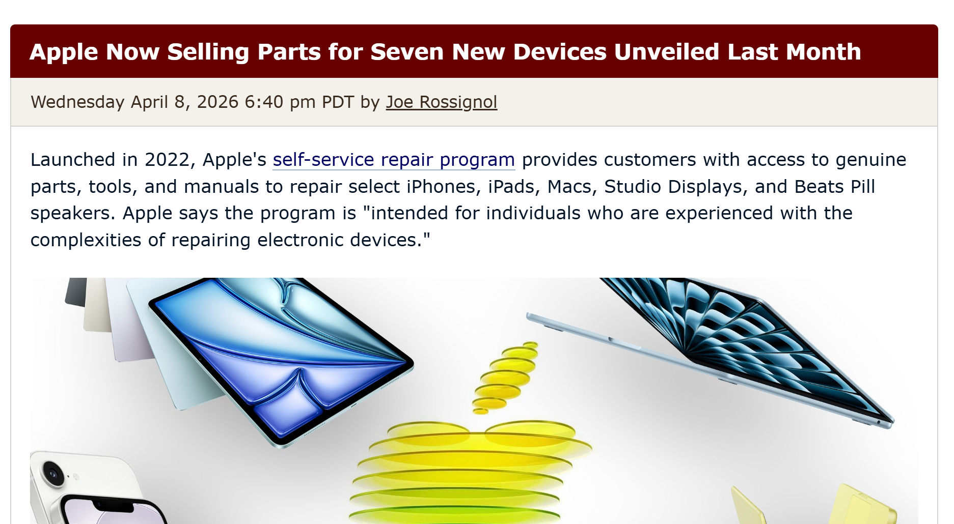 4月9日消息,据MacRumors报道,苹果公司对旗下自助维修计划完成新一轮更新,正式面向公众开放 2026 年 3 月发布的多款新品替换部件,进一步降低用户自主维修门槛,以实际行动响应全球 “维修权” 倡议,提升产品使用与维护便利性。