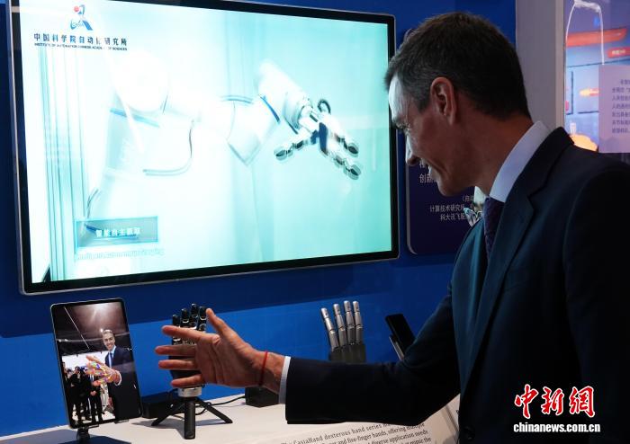 桑切斯参观中国科学院科技成就展过程中进行体验。中新网记者 孙自法 摄