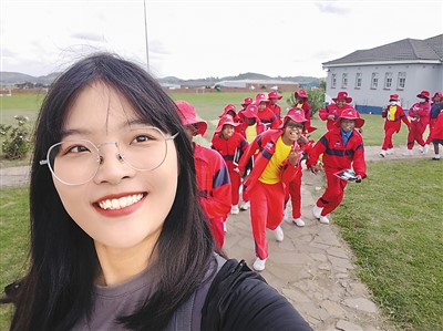 韩亚丹在带学生上课的路上。