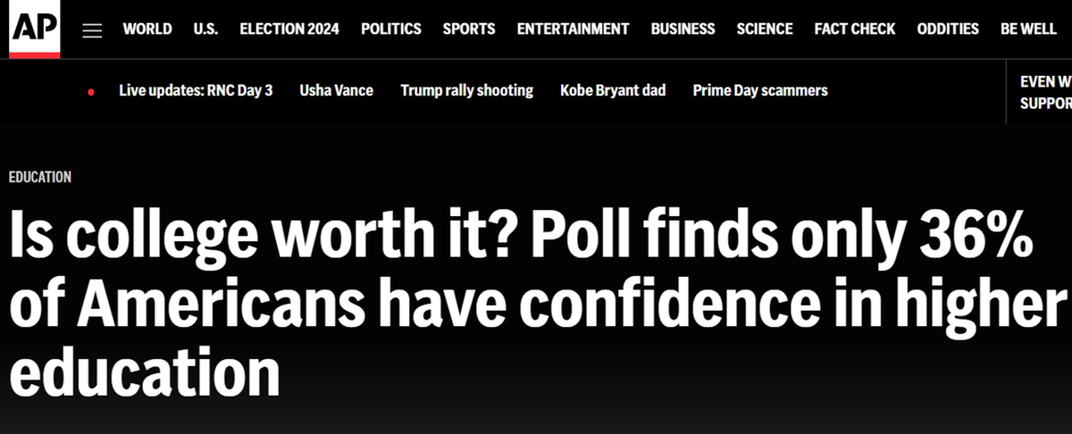 卢米纳基金会副总裁考特尼·布朗表示,“美国人对大学教育的信心一点都没有增长”这一事实令人痛心,更令人震惊的是,“对大学失去信心的人正在增加”。