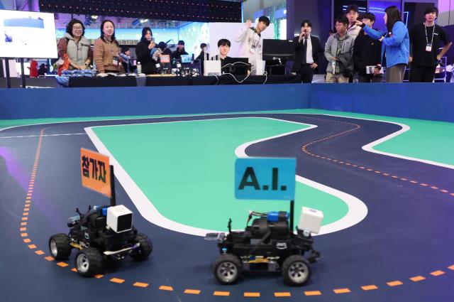 本月26日,在釜山海云台国际会展中心举行的“尖端领域创新综合大学CO-SHOW”上,观众正在观看AI和人类的自动驾驶对决。【图片提供 韩联社】