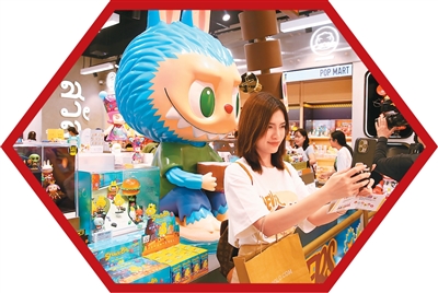 在泰国曼谷的泡泡玛特新店内,一名女子在拉布布玩偶前自拍。新华社记者 孙玮彤摄