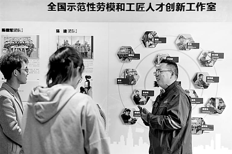 全国劳动模范、国网浙江宁波市鄞州区供电公司调控中心自动化运维班班长张霁明(右一)与中国科学院大学宁波材料工程学院学生交流。新华社发