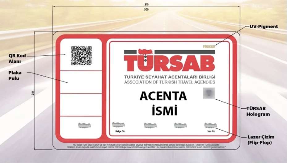 (三)旅游车辆。在土合法运营的旅游车辆须携带土旅行社协会(TÜRSAB)颁发的车辆牌照,有效期1年,每年须续期。2025年牌照样式如下图,牌照上二维码扫描后可显示车辆所属机构信息: