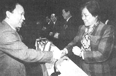 1997年1月,韦钰向全国留学工作先进单位获得者表示祝贺。王呈选 摄