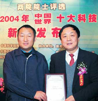 吴建平(右)和老搭档李星(左)参加"2004年中国·世界十大科技进展"新闻发布仪式。