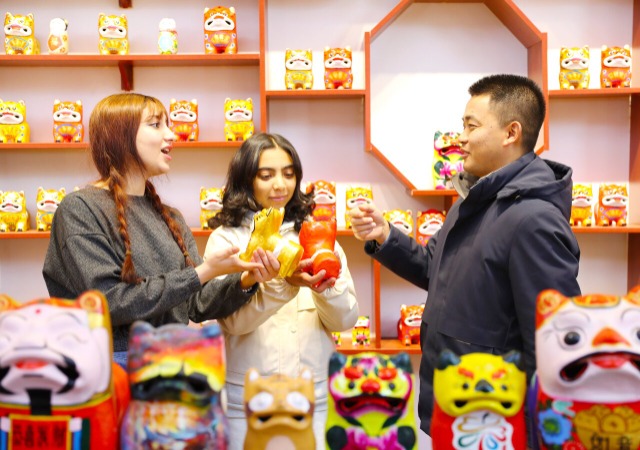 非遗传承人在给外国留学生讲解“泥叫虎”的制作工艺 张进刚 摄