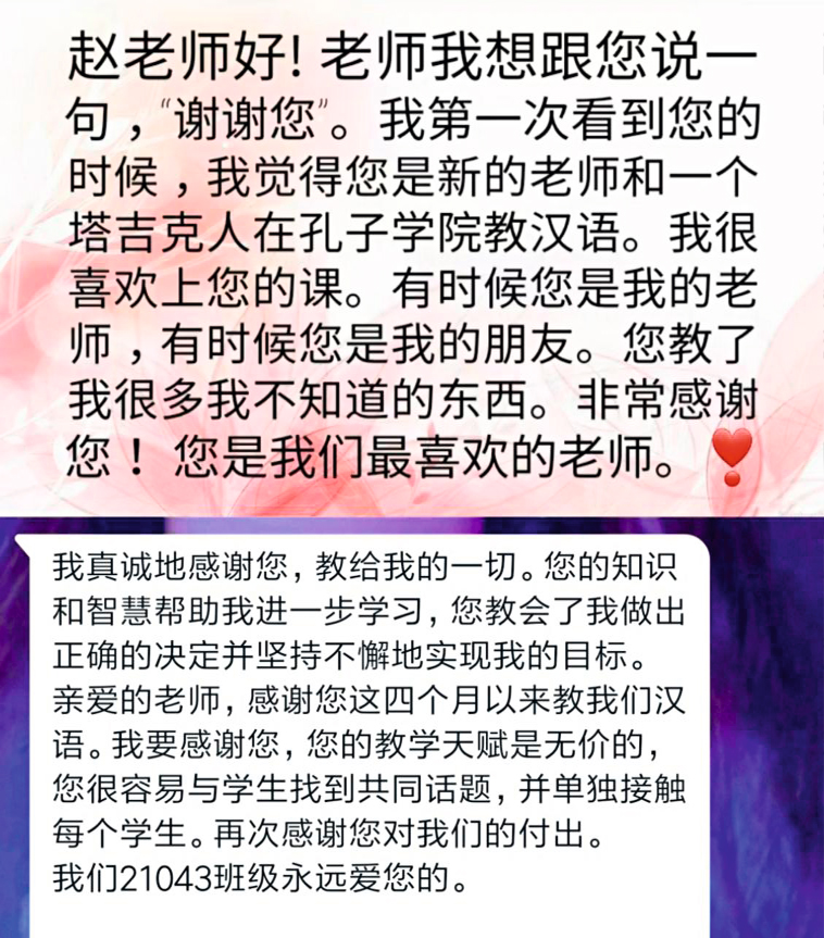 我出生在塔吉克斯坦一个平凡的小乡村,如果没有选择学习中文,我也可能像大多数塔吉克女孩一样,大学毕业后结婚生子,照顾家庭,过着简单而平凡的生活。而今,我不但成为一名中文教师,而且即将与我的中国男友组建家庭。正是我与中文的缘分,让我有了事业、家庭别样的精彩。我感谢生活,感谢许许多多帮助和关心我的人。我愿意做一束光,照亮更多孩子的人生之路。在三尺讲台,继续讲述我与中国的故事,讲好中国发展的故事,让更多人了解真实、立体、全面的中国。