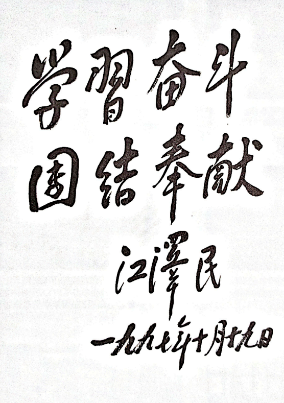 1997年10月,在纪念毛泽东主席在莫斯科接见中国留学生并发表重要讲话40周年的时候,江泽民同志应欧美同学会的请求,写下了“学习、奋斗、团结、奉献”的题词。