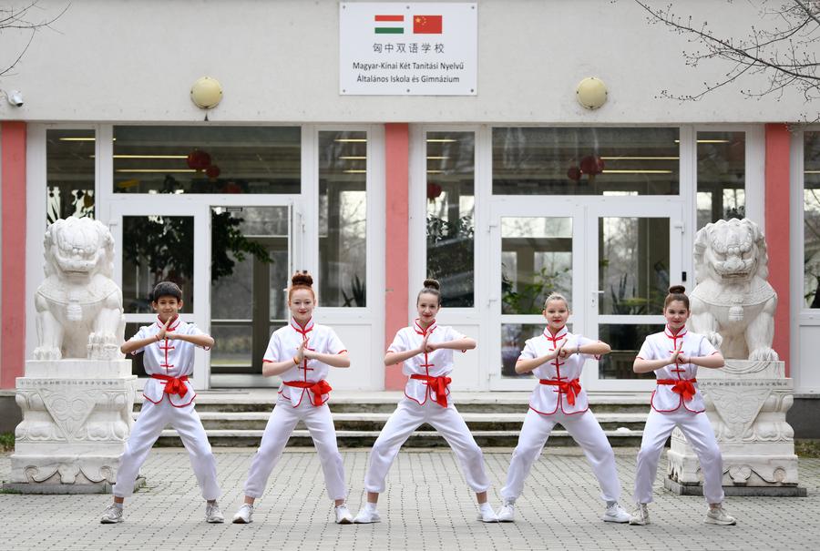 2023年2月24日,在匈牙利首都布达佩斯,匈中双语学校的学生们练习武术动作。新华社记者连漪摄
