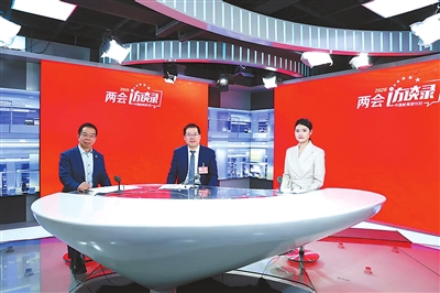 3月11日,全国政协委员、西安电子科技大学校长高新波(左二),教育部教育信息化战略研究基地(北京)主任、北京师范大学智慧学习研究院院长黄荣怀(左一)做客中国教育报刊社“两会访谈录”。冯子琪 摄