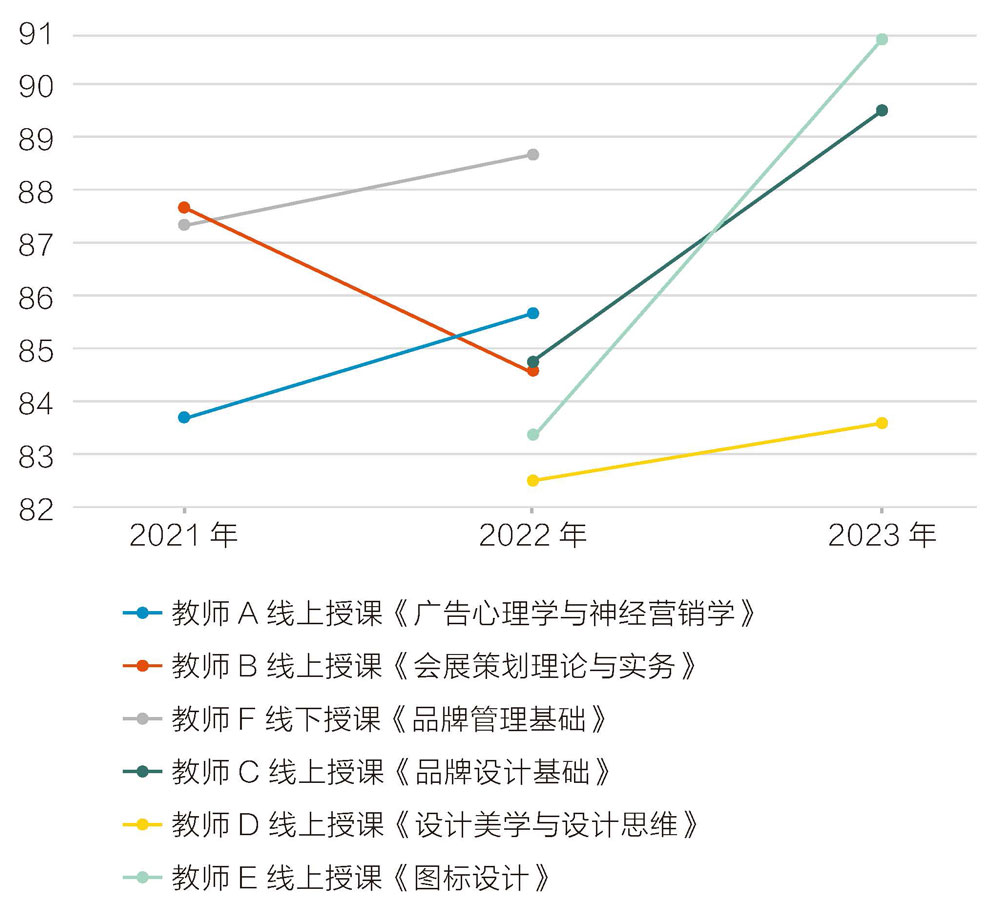 而不同教师教授同一门课程(如图3),除《品牌设计基础》外,其余课程评教分数均有近两分的上升,其中《字体设计1》课程达到了最高评教分90.28分。