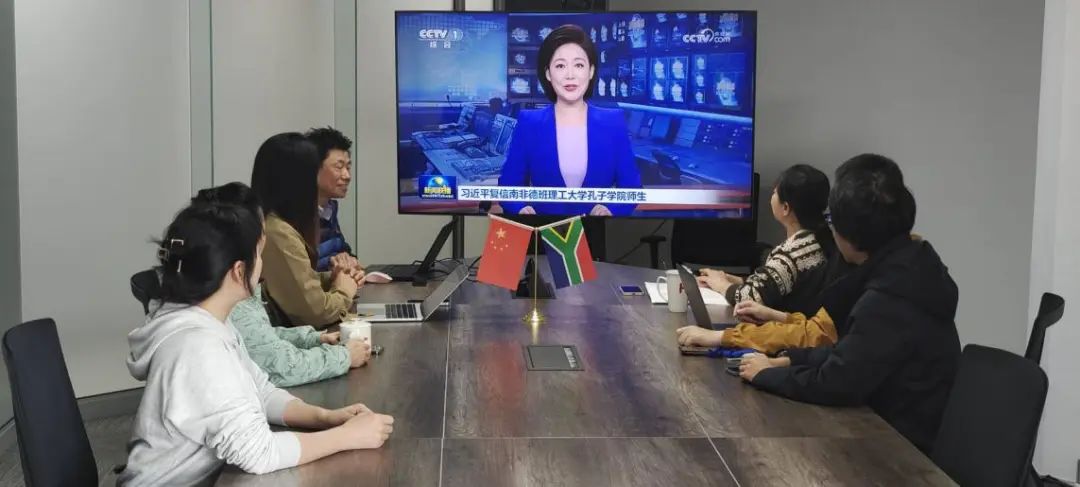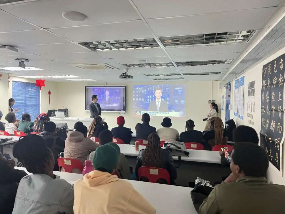 在德班理工大学孔子学院,60余名师生早早自发聚集在一起,第一时间集中收看中国中央电视台《新闻联播》相关报道。