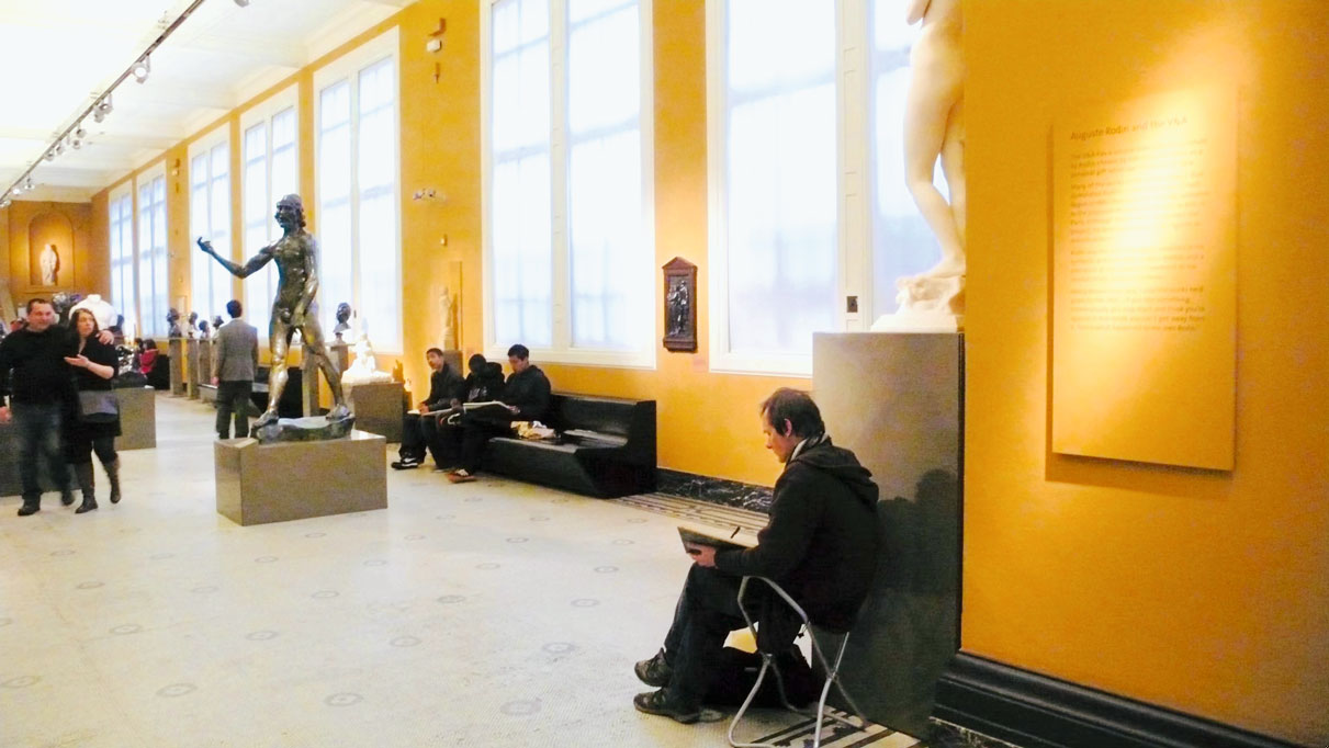 在学生临摹期间,我摸索着频率游走在他们之间,以鼓励为主点评每个人的画面。有些学生一开始会表现出些许在公共场合作画时常见的羞涩,但经过鼓励后,他们会将画面描绘得更加自信和有力。有些学生过分注重细节,在整体进度上偏慢,我就假装不经意地捎个“口信儿”给他们:“刚才我看到咱们班某位同学画的‘好几张’临摹很有意思,你可能也会对那些藏品感兴趣,待会儿过去看看?”