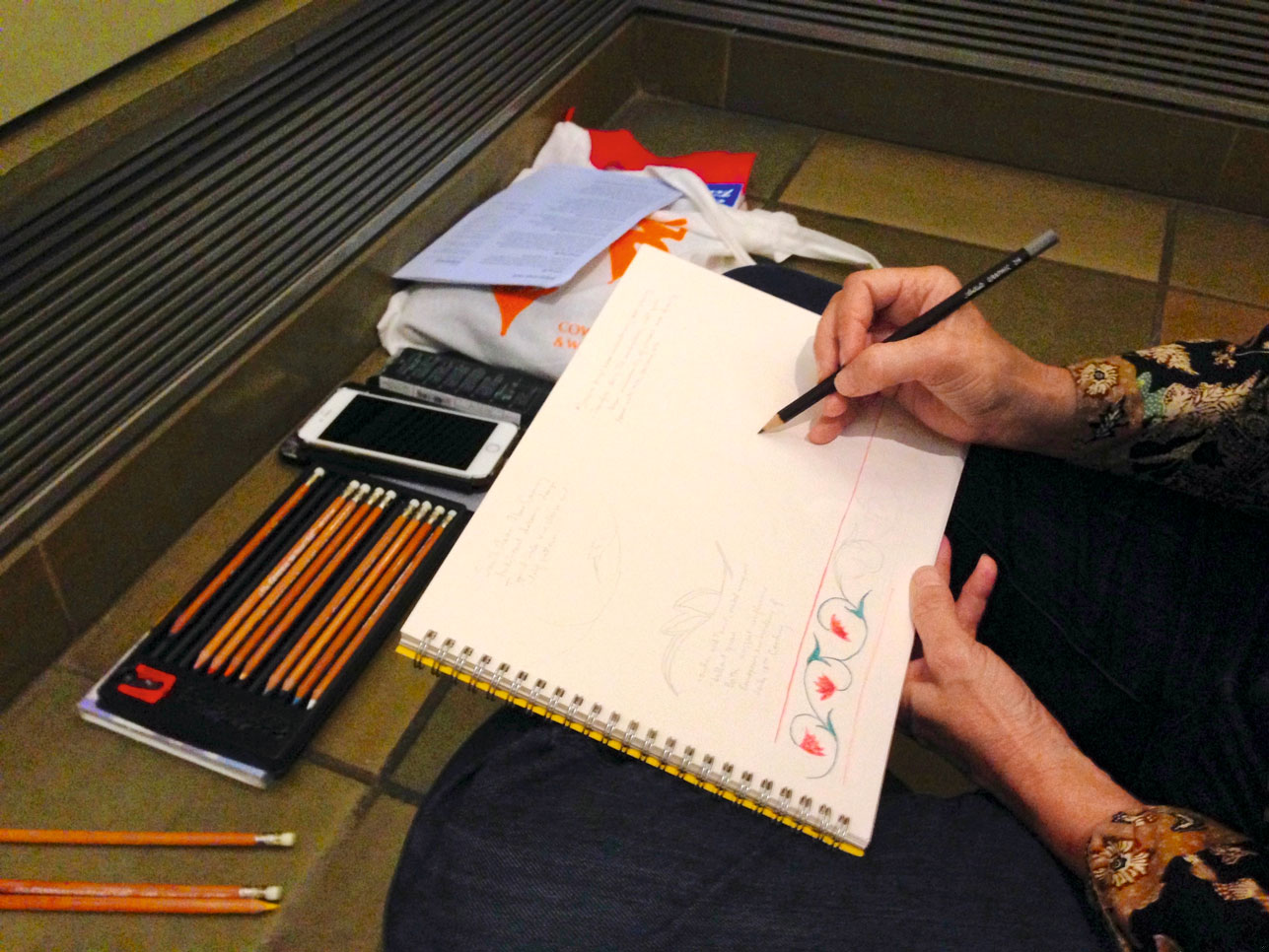 基于我的经验,在事后整理每门专业实践课的笔记时,最希望得到的(往往又总是得不到的)就是一张自己在现场作画的正面照片。这不是一般的娱乐自拍,而是阶段学习的一部分,也是在事后帮助回忆现场学习细节的重要线索和参考。我常因自己去学习又没有同伴帮忙拍照而懊恼,临时请路过的参观者帮忙拍出的照片质量又得不到保障,所以这次我特意带了手机和电脑,方便现场拍照并将照片发给洗印店,以便第二天就能洗出照片发给学生。