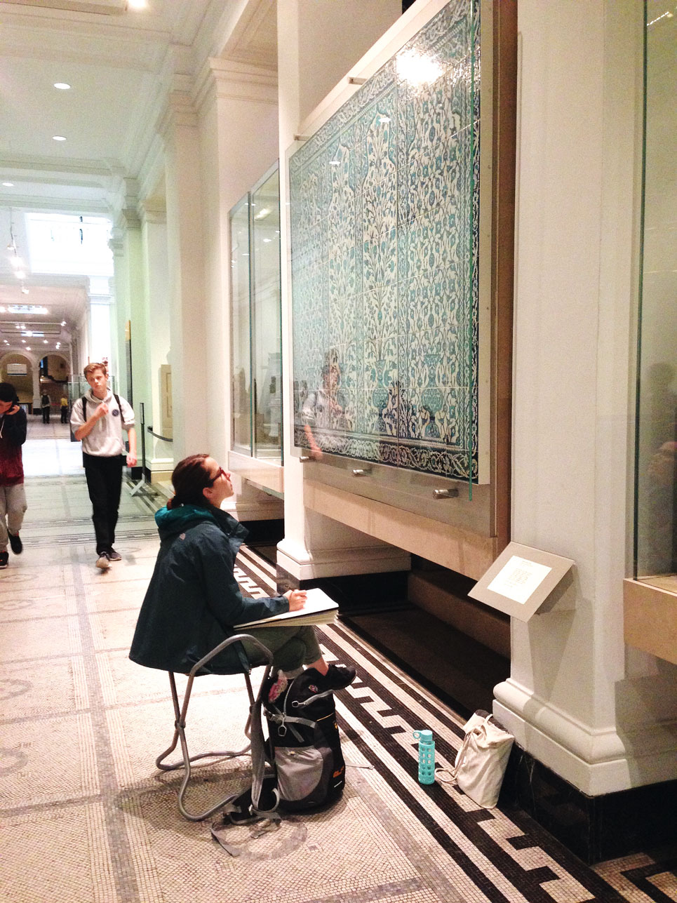 相比之前以参观者的身份出入博物馆,现在以教员的身份带领学生在博物馆学习是一种全新的体验。通过观察和帮助分散在各展区的学生,我对博物馆的认识也提升到了新的层次。每个学生所选取的临摹藏品都很明显地体现出他们的文化与艺术背景,他们的关注点融合了性别、年龄、性格、出身、艺术从业背景等诸多因素。例如,来自土耳其的女生会对细密画边饰设计中的泥金植物纹样格外感兴趣,这与她在故乡街头随处可见的雕刻和亲人们身上披挂的华丽手绣围巾有着密不可分的联系。建筑设计师出身的男同学明显对木雕宣讲台上的直线装饰与木质雕花柱头上的曲线装饰之间的对比有兴趣,自由行动一开始就一头扑向展示橱窗,安静地临摹起来。这些都很有趣地展现了参观学习者与博物馆藏品之间的互动,这是我以前单纯作为参观者不曾注意和体会到的。