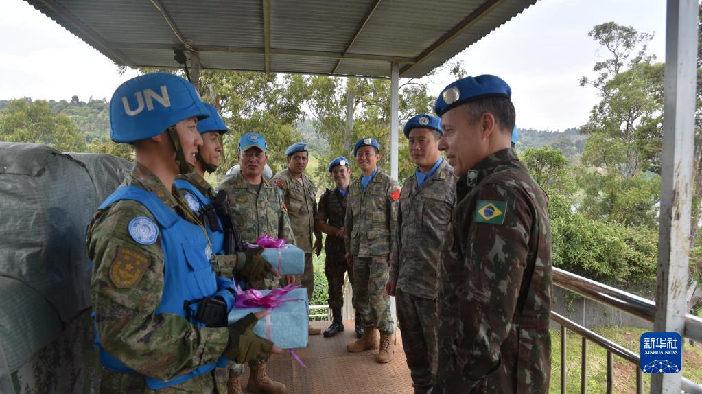 1月21日,在刚果(金)南基伍省,联合国刚果(金)稳定特派团司令科斯塔(右一)对中国第26批赴刚果(金)维和工兵分队进行慰问。 新华社发(中国第26批赴刚果(金)维和工兵分队供图)
