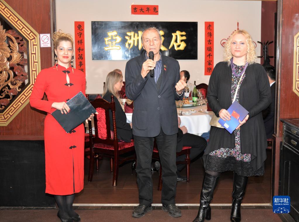 1月22日,克罗地亚中国友好协会在萨格勒布举行招待会,庆祝中国春节。这是克中友协主席卡拉菲利波维奇(中)在招待会上致辞。 新华社记者 李学军 摄