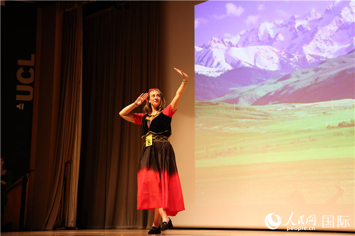 来自伦敦大学亚非学院的梅一苓表演维吾尔族舞蹈《达坂城之韵》。人民网记者 邢雪摄