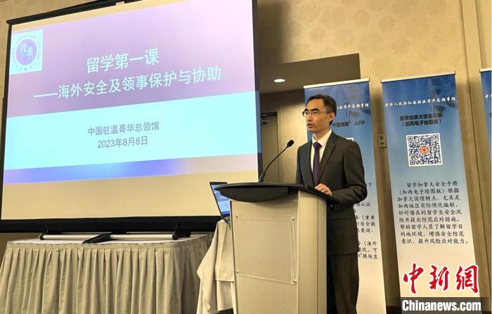 中国驻温哥华总领馆8月8日举办海外安全及领事保护与协助宣介活动,为领区中国留学生开启“留学第一课”。中国驻温哥华总领事杨舒出席活动并致辞。 中国驻温哥华总领馆供图