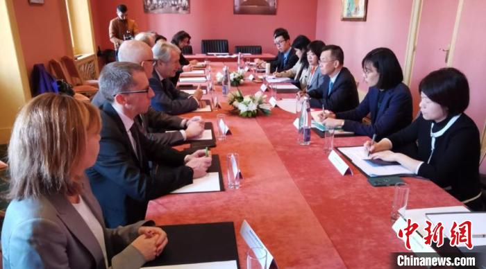 2月15日至16日,中国驻法国大使卢沙野和夫人王立文应邀访问法国诺曼底大区多维尔市和勒阿弗尔市。图为卢沙野与多维尔市市长奥吉尔会谈。中国驻法国大使馆供图