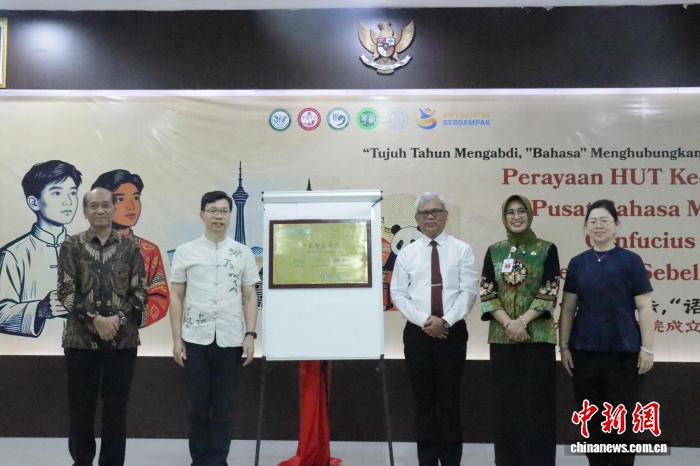 图为嘉宾为汉语水平考试网络考点揭牌。印尼三一一孔院供图