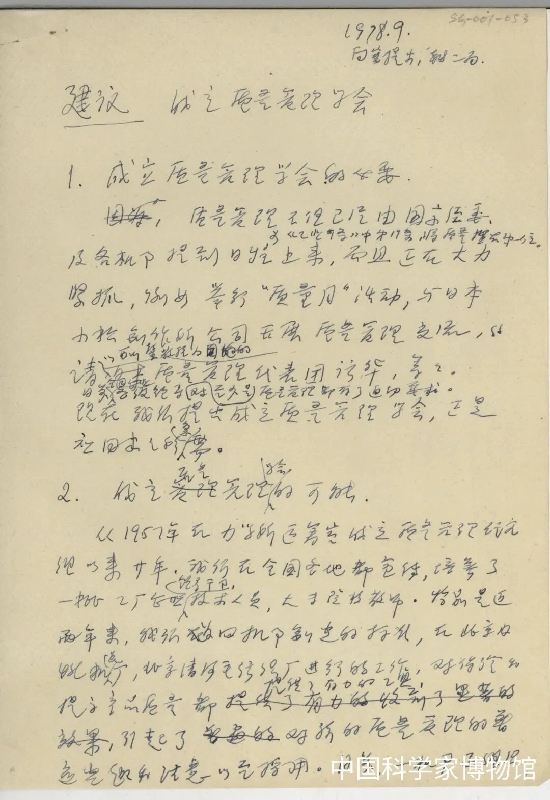 刘源张的手稿《建议成立质量管理学会》。来源丨中国科学家博物馆